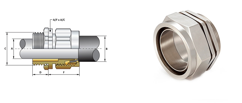 | Size | Standard Thread Size "C" | Thread Length "D" | Cable Diameter | Armour Wire Dia. | Protrusion Length "F" | A/F | A/C | |