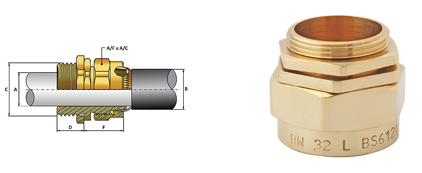 | Size | Standard Thread Size "C" | Thread Length "D" | Cable Diameter | Armour Wire Dia. | Protrusion Length "F" | A/F | A/C | |